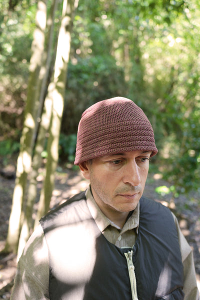 和紙,ポリエステル,ナイロンをブレンドしたシャリ感ある糸を2色混ぜ撚った定番ニットバケットハット